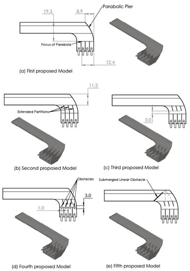 - The fifth proposed model, as shown in Figure 2e, proves that adding submerged obstacles is not an optimal solution for this case study.