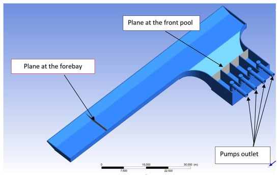 where averages total pressure at the outlet of the four pumps for the average mass flow rate in Pa, averages total pressure at the inlet of the modeled plan at the front pool for the average mass flow rate in Pa, is the water density in kg/m3, and is the gravitational acceleration in m/s2.