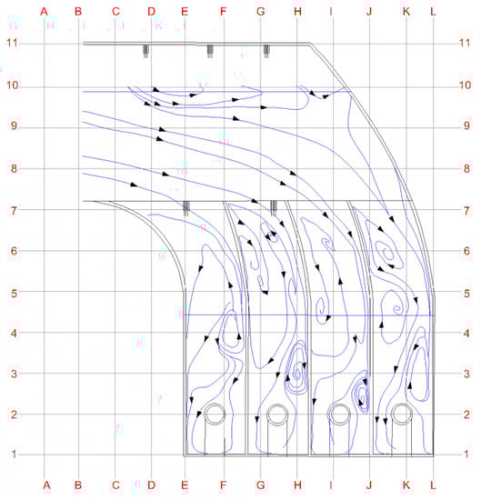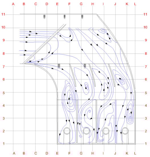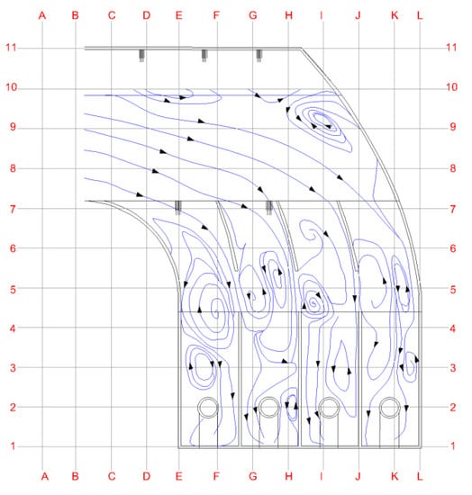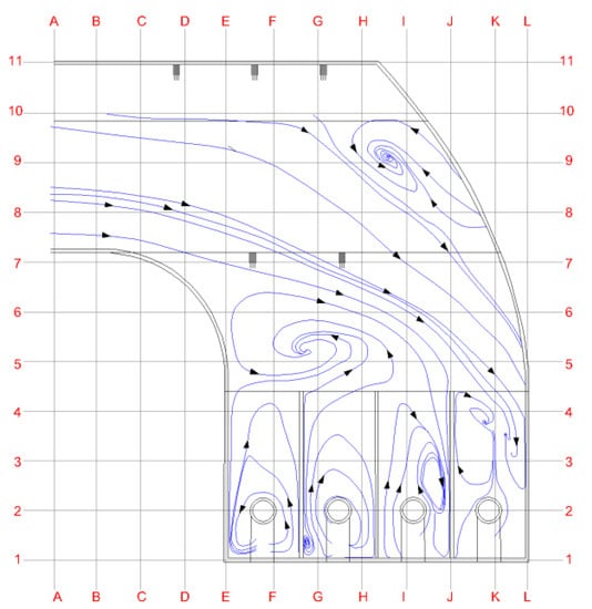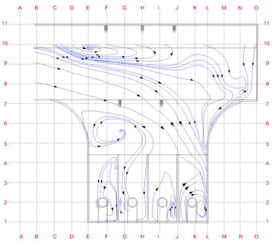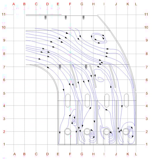 The fourth proposed model appears in Figure 9. It can be concluded that a small vortex near sections H-9 appeared instead of the two whirlpools that appeared in the original case at sections D-9 and E-5. Thus, four small vortices were created, where each one is very close to the pump’s suction in each pool. This resulted from the presence of the four obstacles, which dissipated in the vortices that appeared in the third model and the openings in the pool partition guides.