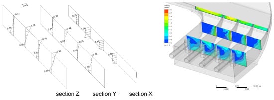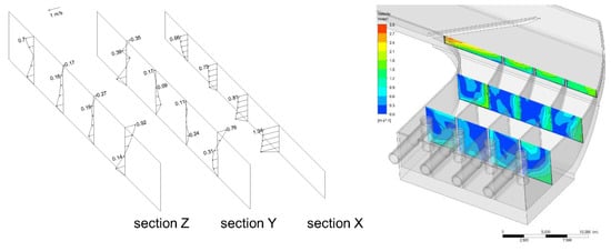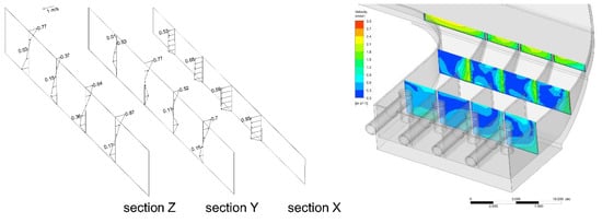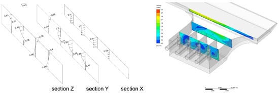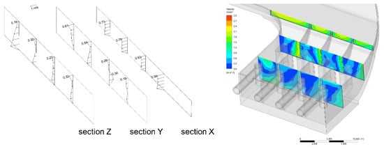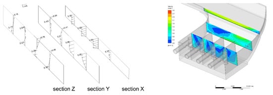 For the velocity distribution shown for the original case, the main flow is biased to the right. The right side of pools shows that flow rate is generally larger than on the left side, and the flow rate from the surface layer to the bottom is gradually reduced. The velocity contours give a significant indication to this bias. This phenomenon appears to be due to backflows, which appeared in section Z in Figure 11. Note that for the shown velocity distributions analysis, section X, Y, and Z are ordered for the velocity distributions shown at the right in Figure 11, Figure 12, Figure 13, Figure 14, Figure 15 and Figure 16. Section X is the farthest from the pumps, while section Z is close to the pumps, and section Y is in between.