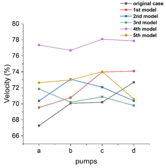The vortices generated affect the velocity of water directly at the pump’s inlet. According to Figure 17, the original case at the pump (a) had the lowest inlet velocity while the pump (d) showed the maximum. This is due to the deflection of the stream towards the pumping pools. The study was conducted to make the deflection effect uniform and increase the speed at the pump’s inlet. By adding the parabolic downstream pier in the first proposed model, the curve pattern seemed to be the same as the original case. From this point of view, the lowest point was at the pump (a) and the highest one was at the pump (d). At the second proposed model, the curve pattern was changed to be the maximum velocity achieved at the pump (b), while the lowest was still at pump (a). The third proposed model for overall pump speed seemed to be less than the second, but pump (a) was still the lowest velocity value. Finally, the optimum appeared in the fourth proposed model in which pump (a) achieved the maximum velocity value against all the patterns of all studied cases. The uniformity reached a better value in the fifth proposed model for pumps (a), (b), and (c) but pump (d) exhibited the lowest value. For the fourth proposed model, it reached the highest velocities at each pump and the deflection of the streamlines was modified to make pump (a) reach the maximum velocity value.