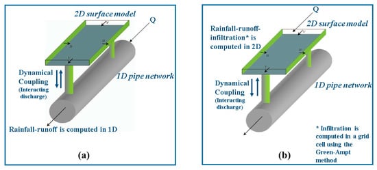 Previous 1D/2D coupled models are combined to simulate the flow dynamics in sewer networks and on the aboveground surface [14,18,19,20,21]. Approaches to representing urban floods are based on two main 1D/2D model interactions as shown in Figure 1.