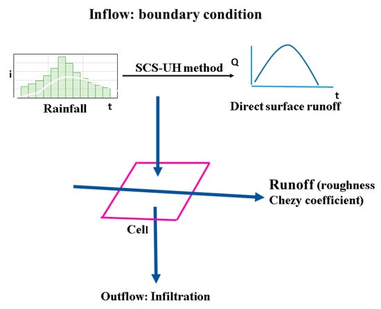 The performance of an outflow hydrograph generator in a 2D model domain was investigated, instead of adding the rainfall rate directly to each cell as a mass source term, as is commonly performed [14,18,23]. In this study an alternative to obtain direct surface runoff resulting from a given excess rainfall hyetograph was obtained by applying the Soil Conservation unit hydrograph known as the SCS-UH method [32]. Figure 3 shows the surface runoff representation in a cell.