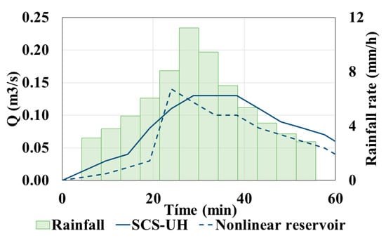 The performance of the outflow hydrograph generator was assessed by the hypothetical case presented in Section 2.6. The initial losses were set to 0.62 mm for both methods following the reviewed values in [33]. This value corresponds to rainfall interception from rooftops, urban trees and depression storage at the start of the design storm. For the nonlinear reservoir, infiltration losses were computed assuming a silt soil class with the following Green-Ampt (GA) parameter values: = {5 mm/h}; = {0.5}; Ψ = {190 mm}. The rainfall intensity was assumed as 70 mm/h at 1-h duration. The result of this process is a hydrograph comparison between the two surface runoff methods (e.g., SCS-UH vs. nonlinear reservoir) as presented in Figure 5.