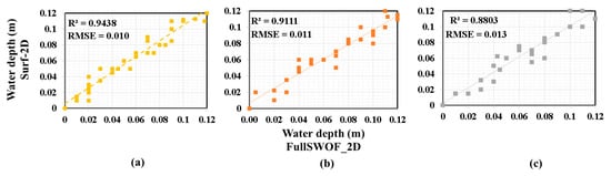 As a sensitivity analysis, Figure 6a–c show the comparison of computed water depths for different GA infiltration parameters combinations (, Ψ) according to [28,35]. The values of each parameter correspond to sand, silt and clay soil classes, respectively. The obtained water depths were compared to those obtained with FullSWOF_2D software. No groundwater component (neither physically nor parametrized) has been included in both models.