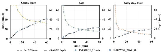 Figure 7 presents the results comparison between the Surf-2D model and FullSWOF_2D in a single grid (point 1, Figure 4a) according to the different soil types given in Table 2.