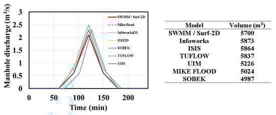 The SWMM/Surf-2D model predicts similar results in terms of peak discharge at the manhole, as can be seen in Figure 8, although volumes differ within a 12% range (e.g., 5700 m3 for SWMM/Surf-2D model and 5024 m3 for Mike flood). Figure 9a,b present water depths at points 7 and 9, which correspond to a green area (See Figure 4b).