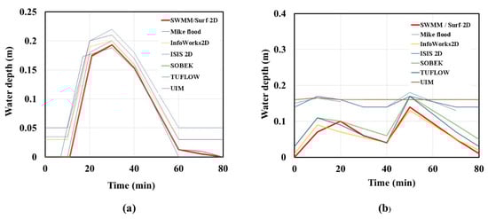 Water depths predicted by SWMM/Surf-2D superimposed with the results from the models published in the EA benchmark 8B [36]. (a) Water depths at point 7; (b) water depths at point 9.