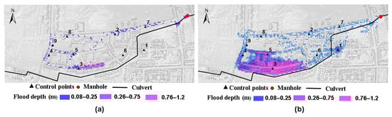 The first 1D/2D model interaction is presented in Figure 10a. The rainfall–runoff process is performed in the 1D culvert. When the capacity of the pipe network is exceeded flow spills into the 2D model domain from manholes and is then routed by a surface 2D model. In this case, the areal extent, maximum flood depth and volume of the inundation region is about 624 m2, 0.38 m and 187 m3, respectively.