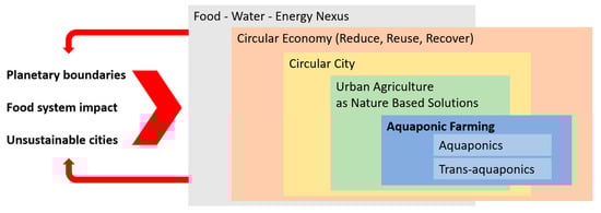 The urban FWE nexus describes interlinkages and interdependencies between the food, water, and energy sectors with their substantial impacts on climate, environment, and land use in an urban context [,]. In the last decade, the urban nexus has gained more attention in research and practice, with a focus on urban metabolism [], tools, and methods for nexus assessment [,] as well as urban governance []. Nonetheless, urban spaces face some specific features such as population concentration, critical infrastructure, high resource consumption, and negative environmental impacts in small areas. These features provide obstacles but also opportunities for sustainable urban development [,]. This applies in particular to the food system, where the places of production and consumption have become increasingly disconnected due to the processes of industrialisation and globalisation in the agri-food sector []. The opportunities of the urban space arise from urban planning and more integrated sector management at the regional scale and their potential to reduce the environmental impact per capita, create synergistic improvements in the urban system, and reconnect cities with their rural hinterlands []. Furthermore, cities have been considered as innovation hubs where new technologies and ideas have emerged and where localised nexus thinking and governance can be tested and implemented [,].