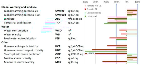 Relative change in LCA impact categories for optimised rooftop-aquaponics (AP) compared to the German market mix for fresh tomatoes and lettuce (mix DE) as +/− 100%; authors work and the calculation based on data from comparative-LCA [].