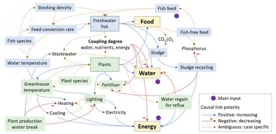 The connectors in Figure 3 are causal links, but can easily be confused with flows. For example, the variable ‘plants’ affects the variable ‘water’ in that water demand increases with the number of ‘plants’, but the water needed flows from RAS to HP. We adopted the syntax of causal loop diagrams and extended it by adding case-specific considerations (ambiguous) that can results in positive or negative link polarity. The FWE nexus influences the AP parameters and creates causal loops, but these are beyond the scope of this study.