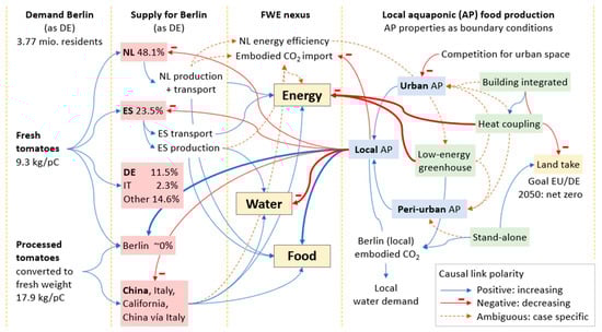 We identified significant AP variables which affect the three sectors of the FWE nexus, either directly or through causal chains, which are useful for controlling environmental impacts when planning or operating an AP. In order to analyse the supply-side causal relations of a production shift to Berlin, we elaborated production-site dependent causal links to the FWE nexus, which mainly include climatic conditions, water availability, and transportation. A moderate ‘climate zones advantage scenario’ with FWE nexus related trade-offs (winter tomatoes from Spain, summer tomatoes from Berlin) is discussed. A production-locations shift should reduce environmental impacts and, to achieve this, many boundary conditions must be taken into account. These conditions include the following: The impact on climate should be at least at the same level as abroad, embodied CO2 should be included, and the environmental impact of food transport (food miles) should not only be reduced to CO2 emission but should also comprise other effects, e.g., abrasion of tire particles. Concerning spatial impacts, it can be stated that ‘building integration’ of urban AP (inside buildings or on the rooftop) reduces land consumption while peri-urban AP mitigates competition for urban space. On the other hand, peri-urban AP results in a conflict of objectives: if realised as standalone facilities, it will increase land consumption, which contradicts the zero net land take by 2050.