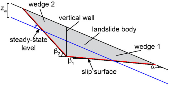 Several methods of practical interest were also published in the literature [23,24,25,26,27,28,29,30,31,32,33]. Such methods are generally able to calculate the landslide velocity when groundwater level measurements are available. Therefore, their use is unsuitable for predictive purposes. To overcome this limitation, Conte et al. [34] developed a simple method based on the infinite slope model to relate landslide mobility to rainfall. In this paper, the approach originally introduced by Conte et al. [34] is extended to more complex geometries. Specifically, it is assumed that the unstable soil mass slides on a bi-planar slip surface and can be schematized by means of a two-wedges model. As highlighted by Chowdhury [35], such a schematization may reasonably represent several real situations. Using some analytical solutions derived in this study and rainfall recorded during a sufficiently long time period, the groundwater level fluctuations are evaluated and the landslide velocity predicted. The proposed solution is simple to use and necessitates few data as input, most of which are determined by means of traditional geotechnical tests, whereas the remaining ones are evaluated using a calibration procedure. After this calibration, the method may be adopted to perform a prediction of future displacements of a given landslide body based on weather forecast.