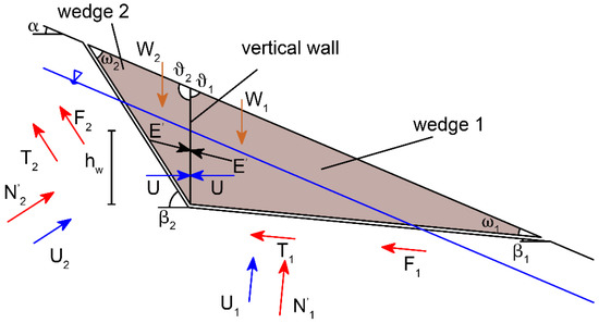 Additionally, in correspondence of the vertical interface between the blocks, the resultant of pore water pressure U and the force indicated by act. The latter is inclined of , with respect to the horizontal plane (with , where is the friction angle corresponding to the material forming the landslide body). Forces Wi, U, and Ui can be calculated using the following equations: