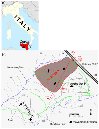 Cerda landslide: (a) location of the Cerda village; (b) plan of the landslide site with an indication of the landslide body considered in the present study (landslide A) and the location of the field test carried out.