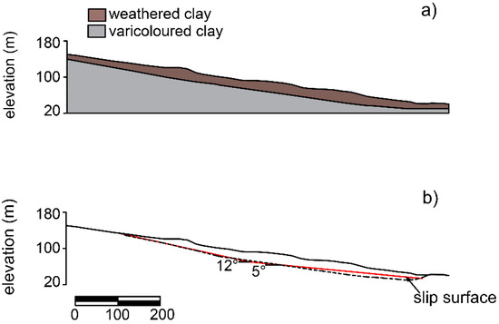 Section A-A’ of the Cerda landslide, whose trace is shown in Figure 4b: (a) longitudinal section of the slope; (b) bi-planar surface used in the present study to approximate the slip surface.
