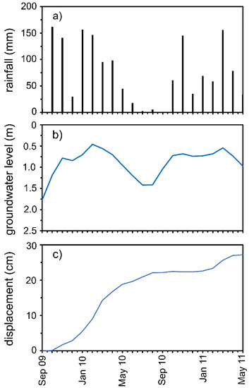 Available measurements from September 2009 to May 2011: (a) rainfall, (b) groundwater level, (c) displacement.