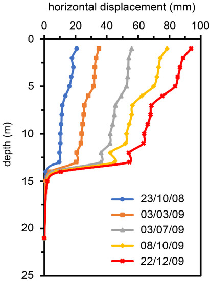 Figure 7 shows the available horizontal displacement profiles of inclinometer BH4 located at the toe of the landslide body (Figure 4b), as documented by Rosone et al. [39]. It is evident from Figure 7 that the soil deformations are essentially located within a well-defined zone situated below the layer of weathered silty-clay. This observation is consistent with the hypotheses on which the proposed approach is based. Shear strength parameters of the weathered silty-clay were obtained by Rosone et al. [39] by performing a large number of direct shear tests. Peak intercept cohesion and shearing resistance angle fall into the range 5–50 kPa and 22°–23°, respectively. An intercept cohesion equal to zero, and a friction angle were found at residual conditions. Considering that the Cerda landslide is periodically activated by rainfall, the residual strength parameters are employed in this work to characterize the soil shear strength in the shear zone. On the contrary, the peak shear strength parameters are employed for the soils forming the landslide body, considering that these soils are affected by moderate deformations. Therefore, it is assumed for the soil in correspondence of the interface between the two blocks (Figure 2). Soil unit weight is γ = 20.5 kN/m3 [40].