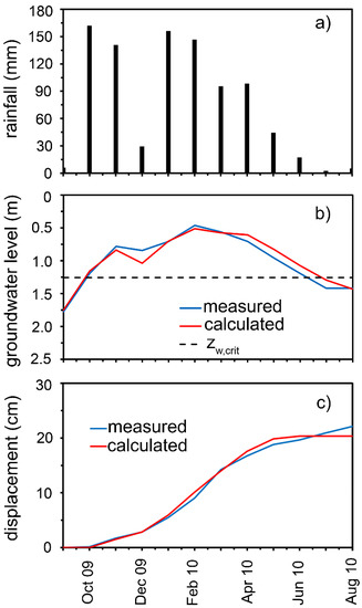 The remaining parameters involved in the proposed approach are calibrated using the above-mentioned procedure by matching the available recordings of water-table and soil displacement with the outcomes obtained using the proposed approach. In order to perform a reliable prediction of the landslide mobility, this calibration procedure should refer to a sufficiently prolonged time interval. To this purpose, the period from September 2009 to August 2010 is considered in the present study and from which the following parameters are obtained using Equation (1) along with rain recordings and groundwater level measurements: p = 161.9 mm/month, A = 0.27, and = 2.9 month−1. In addition, a coefficient of viscosity kN·month/m2 is evaluated on the basis of the soil displacements measured in the same time interval. The calibration results are reported in Figure 8a–c. It is clear from Figure 8b that the groundwater level calculated using the above-mentioned parameters well resembles the measured one. The critical level zw,crit (associated with force Ucrit) is also indicated in this figure for completeness. A reasonably fine accord between theoretical and observed soil displacements is also gained (Figure 8c). As a further requirement of the proposed method, area AA’A” (Figure 3) is calculated in the order of 10−3 m2. This value can be neglected in comparison with the total area of the entire unstable soil mass (12,000 m2).