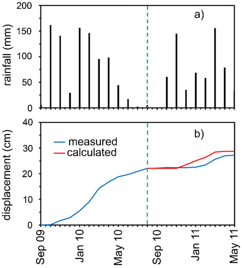 Once the calibration procedure is completed, the method is used to predict the displacement of the unstable soil mass in the subsequent period from August 2010 to May 2011. The beginning of the prediction is defined by a dashed line in Figure 9. A comparison between the calculated displacements and the recorded ones is reported in Figure 9b. The results of this comparison corroborate the predictive capacity of the approach proposed in the present study.
