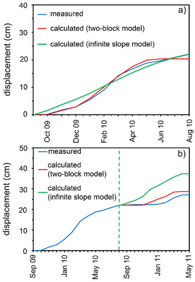 Comparison between the results obtained using the two-blocks model proposed in the present study and a simpler infinite slope model [34]: (a) calibration stage, (b) prediction stage. The dotted line in (b) indicates the beginning of prediction.