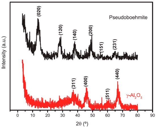 Figure 1 shows the XRD spectra of pseudoboehmite before and after calcination. The spectra show the typical pseudoboehmite peaks (JCPDS 01-1283) found at 13.7° (020), 28.4° (120), 37.9° (140), 49.4° (200), 56.0° (151), and 64.7° (231). The interlinear spacing corresponding to the most intense peak (reflection 020) was around 0.64 nm, which agrees with the higher interlinear spacings found in pseudoboehmites compared to well-crystallized boehmites (around 0.61 nm) [42]. After pseudoboehmite calcination, the most intense peaks were found at 37.5° (311), 46.6° (222), 60.8° (511), and 67.0° (411), confirming its successful transformation to γ-Al2O3 (JCPDS 29-63).