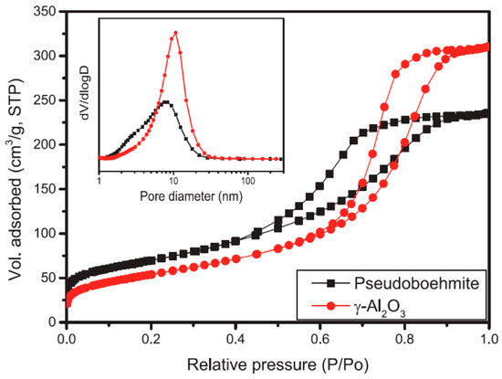 Figure 2 shows the nitrogen adsorption–desorption isotherms and the corresponding pore size distributions of the sorbents. In both cases, isotherms belong to type IV; however, the hysteresis loops are different in size. The isotherms were characterized by a relatively well-defined steep region in the desorption branch of the isotherm curve, at a P/P0 value around 0.45 for pseudoboehmite and 0.50 for γ-Al2O3, which is a characteristic of capillary condensation within uniform mesopores [27].