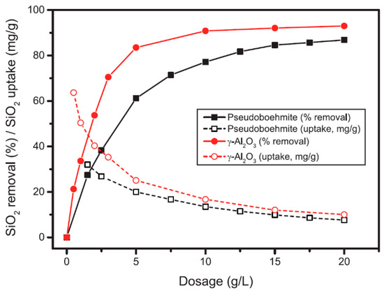Figure 3 shows that silica removal increased with sorbent dosage due to increased sorbent surface area and the availability of more adsorption sites, reaching an equilibrium value as further increases were minor. This equilibrium value was obtained at around 15 g/L for pseudoboehmite (85% silica removal) and 10 g/L for γ-Al2O3 (95% silica removal). At all the dosages, γ-Al2O3 was more efficient than pseudoboehmite. The maximum difference in silica removal efficiency with both sorbents was obtained at intermediate sorbent dosages (2.5–5 g/L); at these sorbent dosages, the silica removal obtained with γ-Al2O3 was around 23% higher than with pseudoboehmite. At higher dosages, the differences in silica removal decreased to 15.7% (at 7.5 g/L) and maintained being almost stable to 6–7% (at 10–20 g/L). The highest efficiency of γ-Al2O3 for silica removal cannot be explained by its BET surface as this is 24.1% lower than that of pseudoboehmite (180.0 vs. 237.2 m2/g). The highest value of γ-Al2O3 is explained by a combination of two facts. First, the pore volume and the average pore size increased from 0.362 cm3/g to 0.476 cm3/g (31.5% increase) and from 6.1 nm to 10.6 nm (42.4% increase), respectively, after calcination. Even though most silica in this study were in the soluble or reactive form, i.e., polysilicic acid and small molecules such as dimers, trimers, and oligomers, the tendency of silica to polymerize to amorphous silica particles which could block of the smallest pores is well known [46]. Second, it is well established that the calcination of boehmites largely increases the surface reactivity while securing the existence of a stable structure of the sorbent [47].