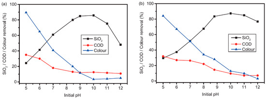 In both cases, a reverse relationship between the removal of silica and organic matter (COD and color) is obtained, which was also observed in previous studies [23,24,25,49]. This means there is a competition for the adsorption sites between organics and silica, the removal of organics being favored at acidic pHs and the removal of silica at alkaline pHs.