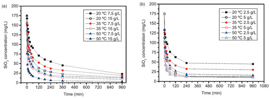 As shown in Figure 5, the kinetics of silica adsorption are fast, especially in the first 10–30 min, then the adsorption rate slows down as silica concentration approaches the equilibrium concentration. The time necessary to achieve equilibrium varied from around 1 h to 4 h, depending on the sorbent dosage and temperature. In all cases, higher sorbent dosages and temperatures required shorter contact times to reach equilibrium, as also observed by Sanciolo et al. [34] Similar results were obtained by Bouguerra et al. [33] and Sanciolo et al. [34], who found most silica adsorption occurred in the first 15–20 min. However, they found silica removal did not vary noticeably at times longer than 1 h, while in the present study the time to achieve equilibrium can be up to 4 h. The faster kinetics observed by Bouguerra et al. [33] could be explained by the high dosage of alumina used (25 g/L) compared to the present study (the particle size of the sorbent was not reported). On the other hand, the faster kinetics found by Sanciolo et al. [34] are justified by the smaller size of the activated alumina used (d50 < 15 µm vs. d50 ≈ 60 µm) as the sorbent dosages were like those used in the present study (2–10 g/L).
