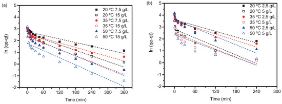 Lagergren’s pseudo-first-order rate fit for (a) pseudoboehmite (b) γ-Al2O3 (experimental conditions: initial pH 8.5, dosages and temperatures in the legend).