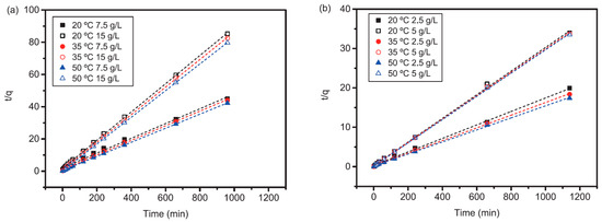 The kinetic data were analyzed by Lagergren’s pseudo first-order (Figure 6) and pseudo second-order rate (Figure 7) models. The Lagergren’s pseudo second-order kinetics always gave the best fit to the experimental data with R2 > 0.99 compared to R2 in the 0.57–0.90 range for Lagergren’s pseudo-first-order (Table 3). This means that silica removal rate is proportional to the square number of unoccupied sites on the sorbent, and thus the fast initial rate of silica removal is explained by the availability of free adsorption sites on the activated alumina. The pseudo-second-order model also fitted best silica adsorption in the previous literature, either on activated alumina [33] or on activated alumina and hydrotalcites [57]. As expected, kinetics were faster at high sorbent dosages: 2–2.5 times higher for 15 g/L compared to 7.5 g/L pseudoboehmite, and around 4 times higher for 5 g/L compared to 2.5 g/L γ-Al2O3.
