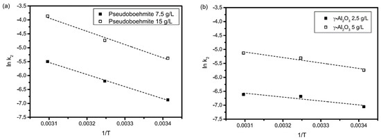 Arrhenius plots for (a) pseudoboehmite and (b) γ-Al2O3.