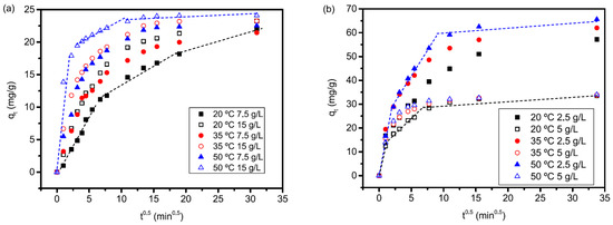 Intra-particle diffusion for (a) pseudoboehmite (b) γ-Al2O3 (experimental conditions: initial pH 8.5, dosages and temperatures in the legend).