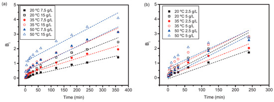 Third, kinetic studies were carried out taking samples at pre-determined time intervals up to 16 h and filtering them through 0.45 μm PTFE syringe filters. These studies were carried out at initial pH 8.5 at three temperatures (20, 35, and 50 °C) and two dosages for each sorbent (7.5 and 15 g/L for pseudoboehmite, 2.5 and 5 g/L for γ-Al2O3). The uptake of the adsorbent at a time t, qt (mg/g) was calculated by Equation (3), where Ct is the concentration of silica at a given time t. Adsorption kinetics was studied using the Lagergren’s pseudo-first-order and pseudo-second-order models, while the intraparticle diffusion and Boyd models were used to determine possible adsorption mechanisms and rate limiting steps. The methodology is further detailed in the supplementary material.