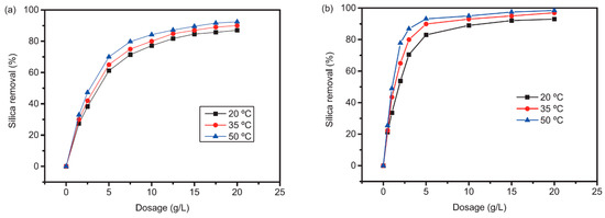 Effect of temperature on silica removal by (a) pseudoboehmite and (b) γ-Al2O3 at different adsorbent dosages (initial pH 8.5, 16 h contact time).
