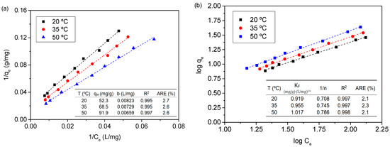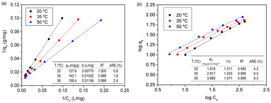 Freundlich and Langmuir isotherms fit the experimental data of pseudoboehmite with a correlation coefficient greater than 0.99; however, the Freundlich isotherm fit with a slightly greater coefficient of determination and a lower average relative error than Langmuir isotherm. Langmuir’s qm, which is a measure of the maximum adsorption capacity, increased from 52.3 mg/g (20 °C) to 91.9 mg/g (50 °C), while b, which is a constant related to the affinity of the binding sites, decreased slightly with temperature from 0.00823 (20 °C) to 0.00659 (50 °C). The dimensionless equilibrium parameter RL increased slightly with temperature, from 0.389 at 20 °C to 0.443 at 50 °C, all these values being lower than 1, indicating favorable adsorption. Freundlich’s constants KF and n were also influenced by temperature. An increase in the temperature resulted in a slight increase in KF, from 0.92 mg/g at 20 °C to 1.02 mg/g at 50 °C. The value of 1/n slightly increased with the temperature, indicating the higher adsorption intensity at higher temperatures: from 0.708 at 20 °C to 0.786 at 50 °C. At all the temperatures tested, 1/n values were less than unity, again confirming favorable adsorption.