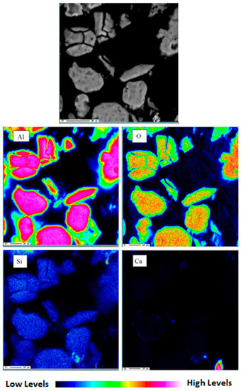 Finally, Figure 14 shows an elemental mapping of used γ-Al2O3 which demonstrates the homogenous distribution of silica on the sorbent particles, while it also appears that a particle of pure calcium carbonate together with the sorbent is observed (down on the right for calcium mapping). According to the observed homogeneous distribution of silica on the sorbents, the main mechanism for silica removal is surface adsorption and not surface precipitation, as proposed by Sanciolo et al. [34] These authors hypothesized that surface precipitation could occur as a result of the reaction of silicate ions with aluminum ions liberated from the alumina at alkaline conditions to form aluminosilicates.