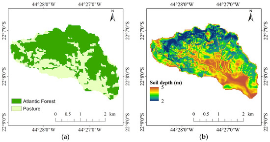 The DEM was derived from interpolating contour line maps from the Brazilian Institute of Geography and Statistics (IBGE). Since simulations were performed at an hourly time step, and overland flow is estimated in the model as a ratio, being the spatial resolution and the time resolution, DEM resolution was defined as 30-m to avoid overestimation of peak flows [36]. A land use map (Figure 2a) accounts for 63% of the area with the Atlantic Forest and 37% with pasture. The watershed’s stream channel was delimited by a threshold of the drainage area of 60,000 m2. A soil depth map was created based on the experimental results of Oliveira et al. [37].