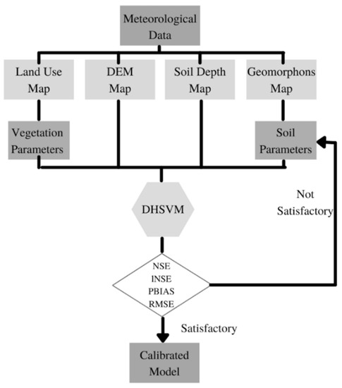 Hydrological models have been widely used in the literature to study watersheds and to predict future impacts caused by environmental changes [1,2,3,4]. These models are developed according to specific purposes. To accurately represent watershed processes, the choice of the model should rely both on data availability and on its ability to address research goals [5]. Distributed physically based models have a large set of parameters and mathematical equations to quantify water balance [6]. As an example, models such as the DHSVM (Distributed Hydrology Soil Vegetation Model) [7] require information on the spatial distribution of hydrological parameters at a fine scale [8]. These models should be able to create realistic simulations when properly parameterized. However, in many regions, their application is limited due to the required data, so in case of data deficiency conditions, conceptual methods are commonly used [9].