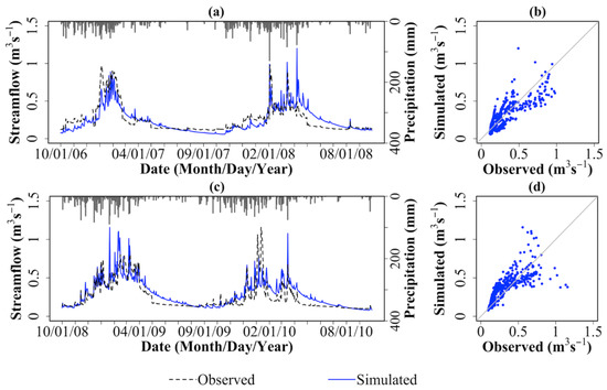 Observed and simulated streamflow in the DHSVM (calibration (a,b); validation (c,d)).