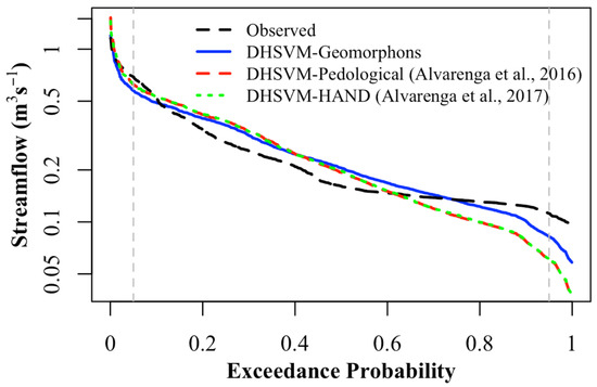 For exceeding probabilities between 20% and 70%, DHSVM simulations with Geomorphons, pedological, and HAND maps exhibited a similar behavior: all of them produced FDCs with a slope greater than the observed. For this range of probabilities, the FDC is determined by percolation rates: a mild slope of this segment indicates a larger soil storage capacity and, consequently, sustained groundwater flow [46]. Therefore, although there is an improvement in performance statistics and peak and base streamflow simulations, the increased spatial variability of soil parameters did not affect the simulated watershed storage capacity.