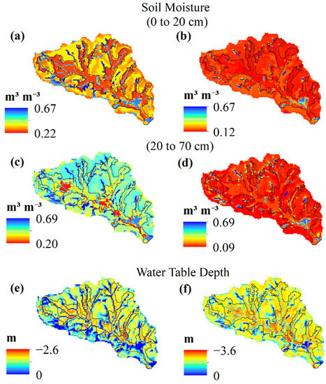 Soil moisture (m3 m−3) in the layers from 0 to 20 cm (a,b) and 20 to 70 cm (c,d) and water table depth (e,f); on 3 February 2008 (left column) and 11 August 11 2007 (right column), simulated by the DHSVM in the LCW, black contour line outlines the Geomorphons features “hollow”, “valley”, and “pit”.