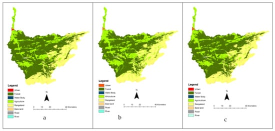 Land use maps for: (a) 2010, (b) Continuity scenario (2040) and (c) limitation and conservation scenario from left to right.