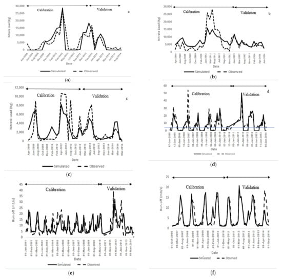 Observed and simulated nitrate during calibration and validation period at Kordkhil (a), Rigcheshme (b) and Solaiman Tange stations (c) and Observed and simulated run off during calibration and validation period at Kordkhil (d), Rigcheshme (e) and Solaiman Tange (f).