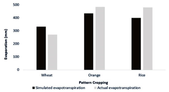 Using the criteria suggested by Moriasi et al. [33] and Ahmadisharaf [34], the model represented the observed flows and nitrates satisfactorily, during both the calibration and validation periods. Model evaluation statistics and optimized parameter values for calibration and validation of runoff and nitrate for the three stations are presented in Table 3 and Table 4. Observed and simulated nitrate during calibration and validation period for the three stations are presented in Figure 4. Also, Figure 5 shows the simulation values and the reported values of the National Water Document. The results of this figure indicate the proper performance of the model in simulating real evapotranspiration. Due to the lack of lysimetric data in the region, the maximum reported evapotranspiration rates from the Iran National Water Document in the study area were used as a basis for comparison and calibration of the model for each crop in wet years. The mean values of simulated evapotranspiration were compared with the mean values of maximum evapotranspiration reported by the Iran National Water Document [47].