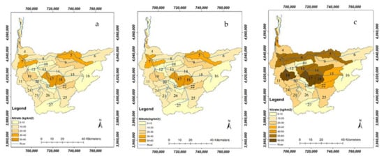 Future LULC change (business-as-usual) can result in up to 100% increase in nitrate load by up to 29 kg/km2 in the Tajan watershed (Figure 6b). Analyzes of subwatersheds in 2040 showed that in many subwatersheds, where agriculture areas increased, nitrate loading also was increased. Such an increase in nitrate load could be due to growing crops in newly transformed areas that would require fertilization. Subwatersheds 6 (upstream) and 10 (midstream) exemplifies the opposite trend of other subwatersheds, where both forest and pasture LULCs were converted into croplands but increase in nitrate load was still low. This can be due to the agricultural growth. Therefore, although we find a positive relationship between the changes in LULC and their impact on nutrient loading, other characteristics of subwatersheds such as topographic slope may also play a vital role in nutrient export by the subwatersheds [57]. In upstream subwatershed 21, the increase in cropland area would produce less nitrate load. On the other hand, midstream subwatersheds 19 and 14 have relatively small LULC change but nitrate loading significantly increases in these subwatersheds.