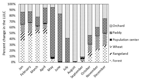 By calculating the average monthly values of nitrate load in the simulation period separately for each user and then estimating the share of each user compared to other uses, the pattern of monthly nitrate changes per user was obtained, which is shown in Figure 7. Pastures, which cover 23% of the watershed, only 5.7% of the nitrate load of the basin, while agricultural lands, which cover only 20% of the study area, yield more than 64% of the nitrate load. Nitrate pollution in the agricultural LULC seems to be higher than other LULCs, primarily due to the application of chemical and animal fertilizers, suggesting that the abundant fertilization in agricultural fields has a negative effect on the water quality. In confirmation of this, many studies have reported that urban and agricultural use plays an essential role in reducing water quality in the adjacent water system, changing soil surface conditions, increasing impermeable surface, and producing pollution. Additionally, the amount of nitrate load produced by a cropland depends on the type; rainfed wheat, rice and orchards are the main crops in this region. Rainfed wheat accounts for 13% of the nitrate load, while about 55% of the agricultural land is allocated to this crop. As a result, less polluted runoff is produced and nitrate transfer is postponed to the beginning of the rainy season and with the increase of surface flows in October, December and September, there is a significant increase in the amount of nitrate output in this LULC. Paddy fields account for 25% of the agricultural area and 25.5% of the annual nitrate pollution. Different rice cultivation compared to other crops, the use of abundant fertilizer and a long period of flood cultivation have caused soluble nutrients to be easily lost. It is observed that nitrate output from rice fields reaches its maximum in the spring (May-June). Considering the cultivation and fertilization stages in this season, it seems reasonable to increase nitrate transfer from paddy fields. Nutrient loss occurs when water overflows from paddy fields during rainfall events and overflows [60]. About 20% of the agricultural land is covered by orchards, while 25.5% of the nitrate production is shared. Orchard cultivation, like rice cultivation, has a high share in nitrate output. Orchards have the highest nitrate content in the summer. This increase may be because in the warm months of the year, the amount of irrigation reaches its maximum, which causes the transfer of large volumes of nitrate. Animal manure is also used in large quantities in orchards that the application of this manure is always associated with the loss of large amounts of nitrogen and leaching excess amounts can increase the pollution load to the water. Population areas cover 1.3% of the basin but produce 6% of the nitrate pollution. The load leaving the population centers due to the population sewage caused by the population centers flows in almost all months, except the dry season of the year, and increases with rainfall. The results are consistent with the previous studies [50,51,61] on the positive relationship between the area of agricultural lands and discharge and negative relationship between the area of forest and rangeland LULCs and discharge.