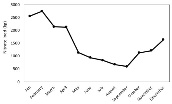These results are consistent with the study by Lee et al. [51]. From May to September, nitrate levels are inversely related to plant growth; nitrate load decreases with increasing vegetation and increases from September with harvest [63]. This indicates that nonpoint sources such as agricultural runoff play a major role in production of nitrate loading. Further, due to the decrease in rainfall in summer, the pollution transport in the river has decreased. Reduced nitrogen removal and reduced consumption by plants and microbes due to snow accumulation and low water temperature can also cause higher nitrate levels in the winter [59].